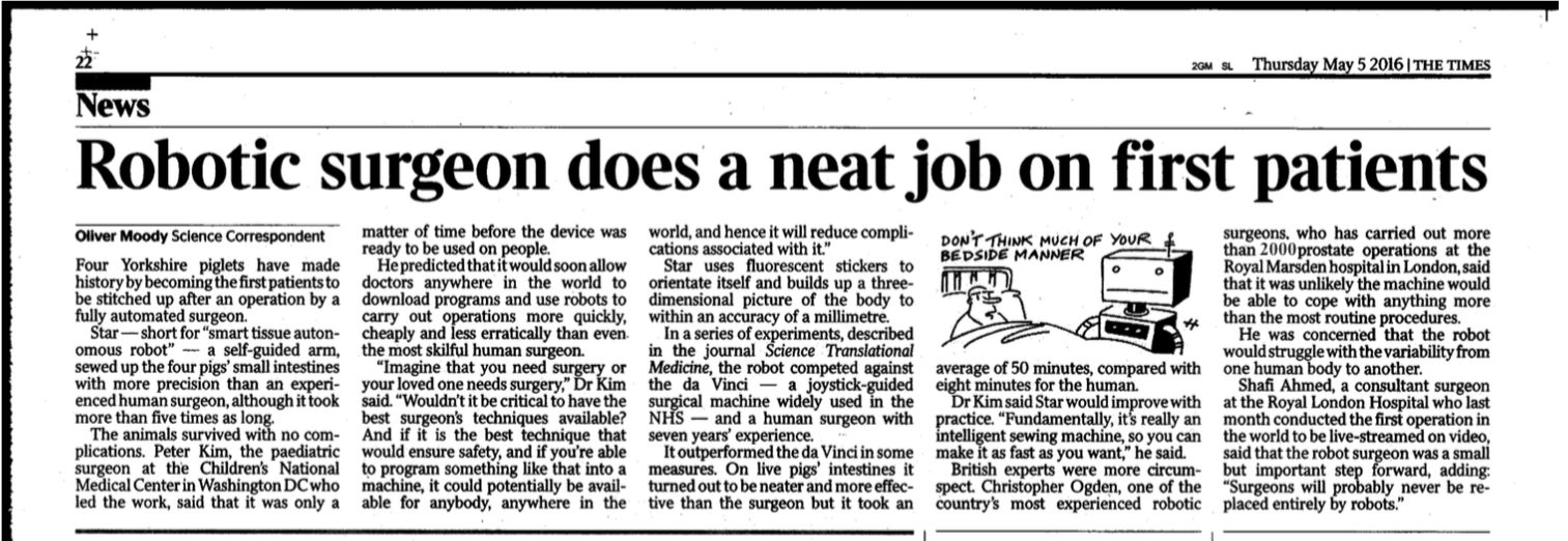 Whilst the paediatric surgeon, Peter Kim, who led the work contends that it is only a matter of time before the device will be ready to be used on people, British expert, Christopher Ogden feels that it is unlikely the machine will be able to cope with anything more than the most routine procedures.